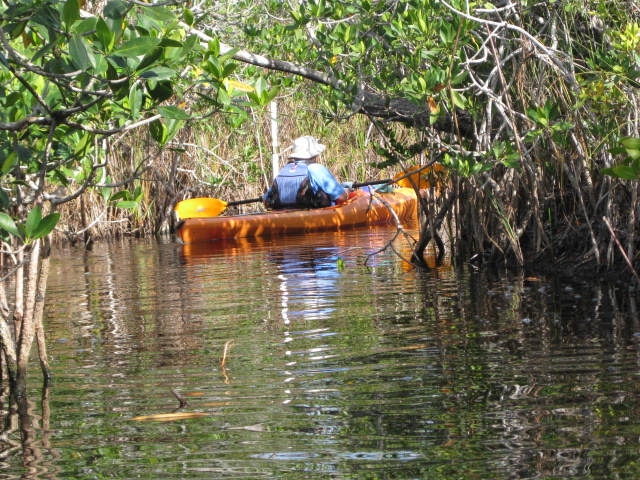 We had originally planned to leave the next morning, but we were enjoying ourselves so much we decided to stay over another day. Tuesday morning we were up bright and early and headed to Flamingo to try to get on the Flamingo Morning Canoe Trip. We had been told it was sold out but we thought we might be able to “walk on” if someone didn’t show up. We didn’t get on the trip so we decided to kayak on our own. We chose to go down the Hell’s Bay Canoe Trail. It’s called Hell’s Bay because it is hell to get in and hell to get out. The channel was really narrow. There were some times when it was almost impossible to paddle with a double-bladed kayak paddle. Canoes have a definite advantage here. It was a good thing that the channel was marked with PVC poles because without them to guide us, we would probably still be paddling around trying to find our way out!