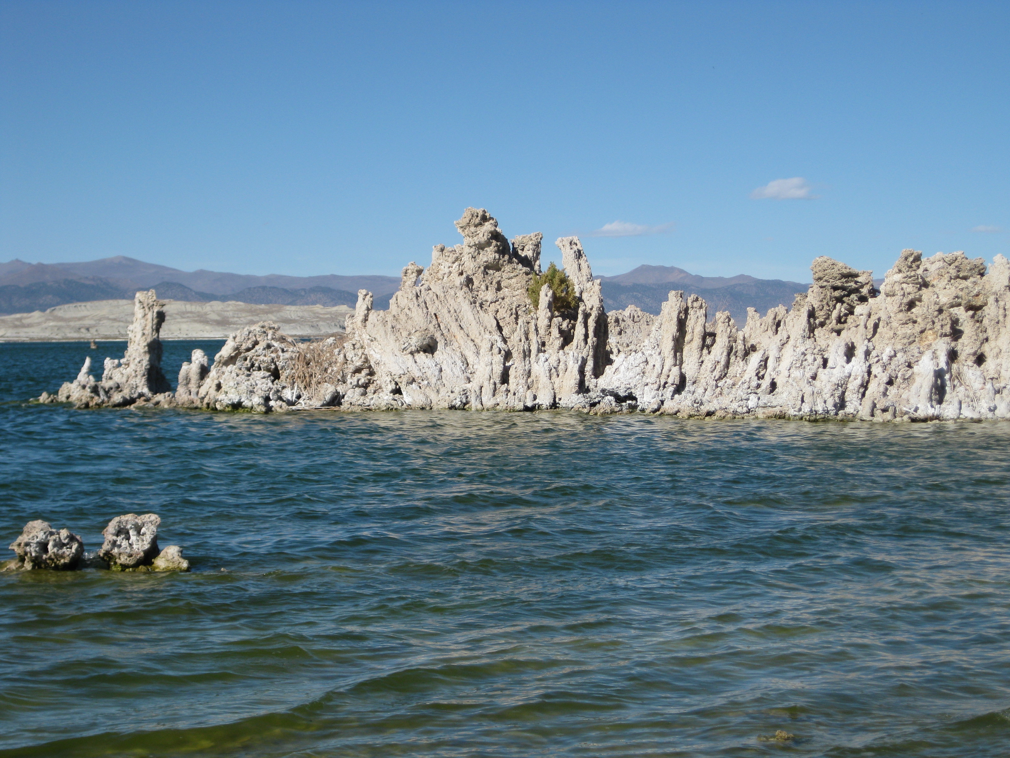 About ten miles north of June Lake is Mono Lake which has the same characteristics as the Great Salt Lake in Utah.  It is fed by streams and rivers but doesn’t discharge it’s water anywhere, except by evaporation.  As a result the salt and other minerals remain.  The salt content of Mono Lake is three times saltier than the Pacific Ocean.  Mono Lake is a stopover for many migratory birds, some of whom travel as far as Brazil and return each year.  Bob found Mono Lake to be an interesting story of progress and development versus conservation.  In the 1970’s Los Angeles purchased land in the mountains around Mono Lake and built aqueducts to divert water from the rivers and streams to Los Angeles.  As the population of Los Angeles increased, the amount of water diverted also increased and Mono Lake started to dry up.  Finally David Gaines, a local citizen, started a committee to challenge Los Angeles’ actions.  Eventually the U.S. Court decided that Mono Lake had to be maintained at a minimum level for the maintenance of the lake, protection of wildlife habitat, and the water needs of the local communities.  This effort is ongoing today and the lake levels are rising.  One of the interesting geologic features of Mono Lake are the Tufa.  These are created when the fresh water springs, rich in calcium, bubble up through the carbonate-rich lake water.  The calcium and carbonates react to form calcium-carbonate salt deposits which are called Tufa.  This solid, limestone-like material continues to develop, forming vertical towers with the spring water percolating up through them.  As the lake receded in the 1970’s, these Tufa became visible.