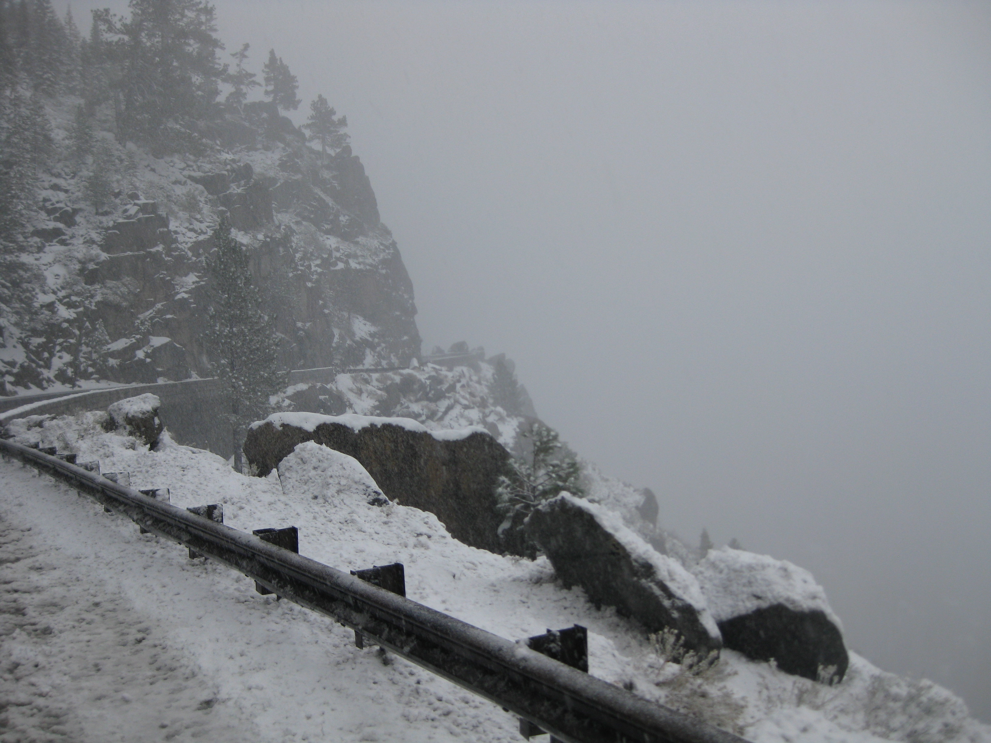 In order to get back to our trailer, we had to cross over the Sierra Nevada Range.  There are other passes over the mountains, but they could be closed as well.  We headed north toward Sonora and Placerville and when we got cellular coverage Pat called the California Department of Transportation hotline.  We quickly found out our next option, Sonora Pass on Route 108 was already closed, then we found out that the next one, Ebbetts Pass on Route 4 was closed as well.  Shortly after that we found out our third option, Carson Pass on Route 88 had been closed.  The hotline suggested that Echo Pass on Route 50 was still open, but you had to have tire chains or a four-wheel drive vehicle with snow tires on all four wheels.  We had four-wheel drive and good tires, but they were not snow tires.  As we drove into Jackson, CA we saw a sign for a California Highway Patrol station and stopped in.  Thankfully we were told we would meet the requirements with our vehicle and we just hoped Route 50 stayed open.  The higher we got in elevation, the worse the driving conditions became.  There was blowing wet snow and at least an inch of slush on the road.  This was nothing that we had not been used to in Michigan, but there you didn’t have a 7,000 foot mountain to slide off.