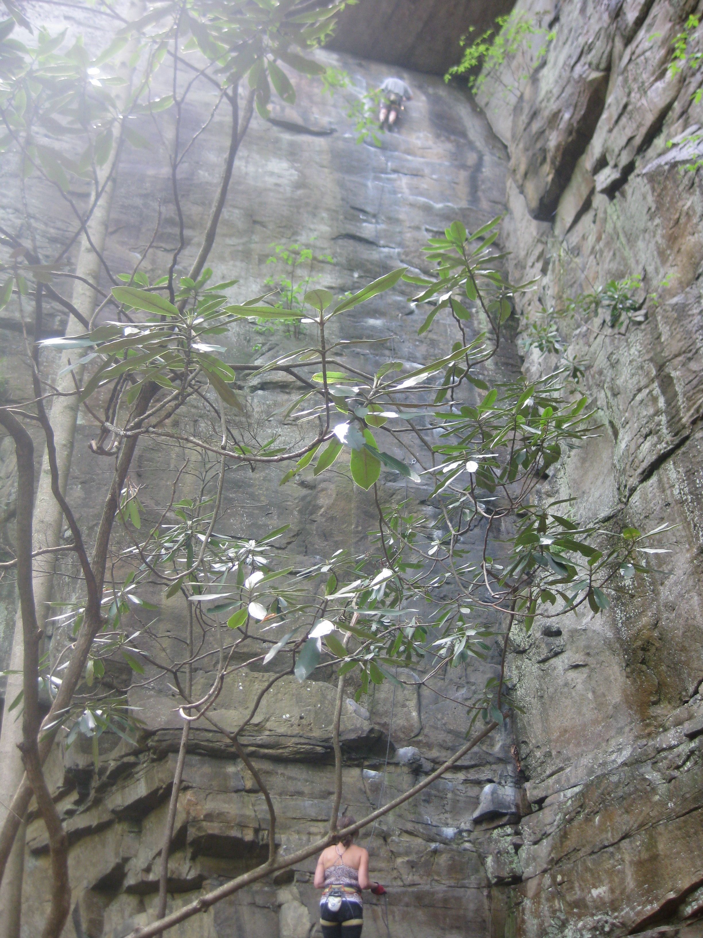 a man rode in on his trail bike. He had grown up in the area and was able to give us more insight into the challenges faced in the construction of the bridge. The New River Gorge has some great rock climbing sites and one site was on a spur trail from the one we were on. I went down it to the cliff and watched two climbers doing their thing – it was something to watch them go up like spiders on the rock face.