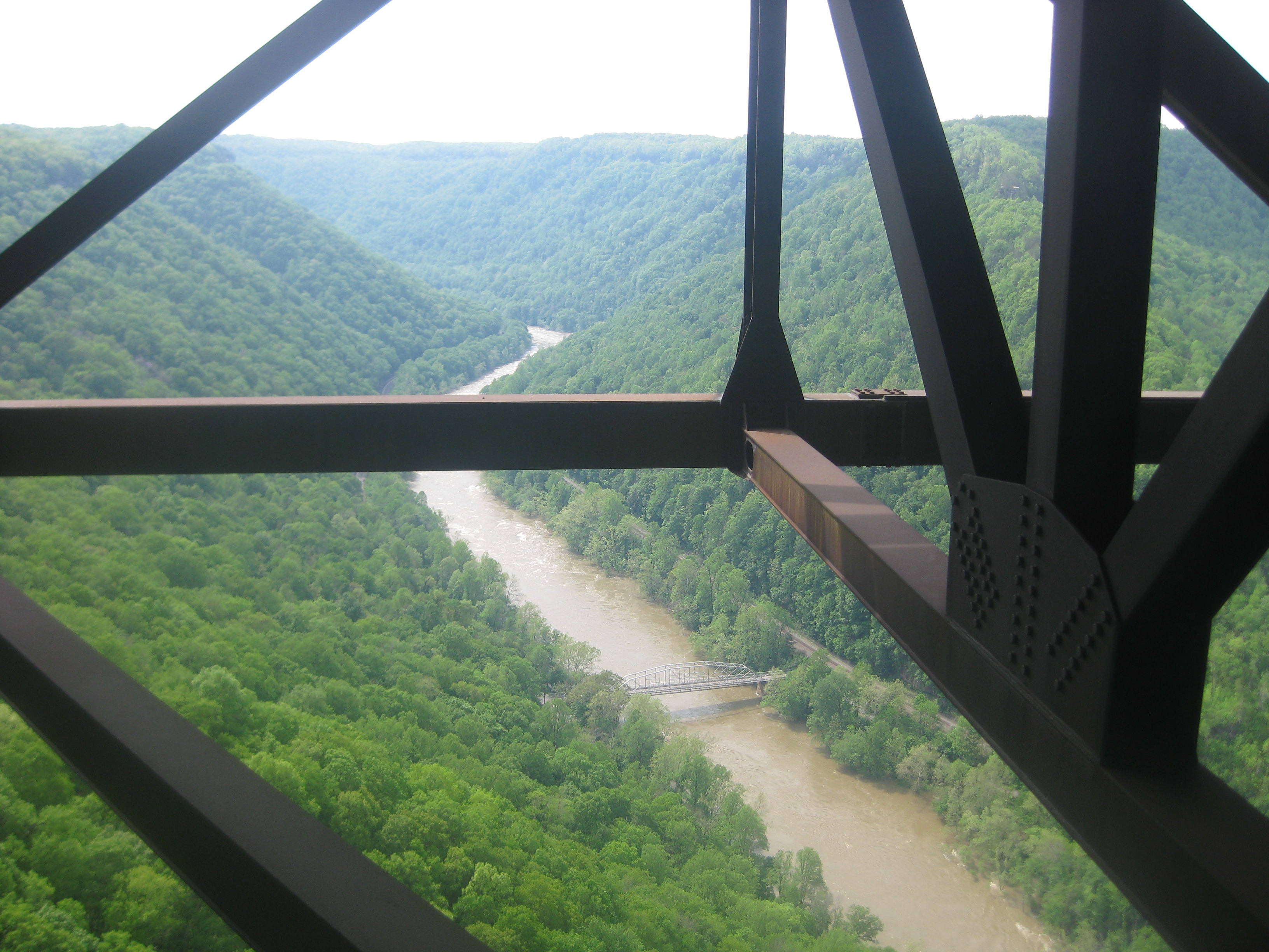 in the area is to take a guided walk on the catwalk that goes under the Gorge Bridge. You are hooked on to an overhead cable as you travel under the roadway. The bridge is shaking from side to side from the wind and traffic and the views are terrific. Our guide told us about the history of the construction and the events of Bridge Day. We were able to see where rappellers hook onto the bridge for their