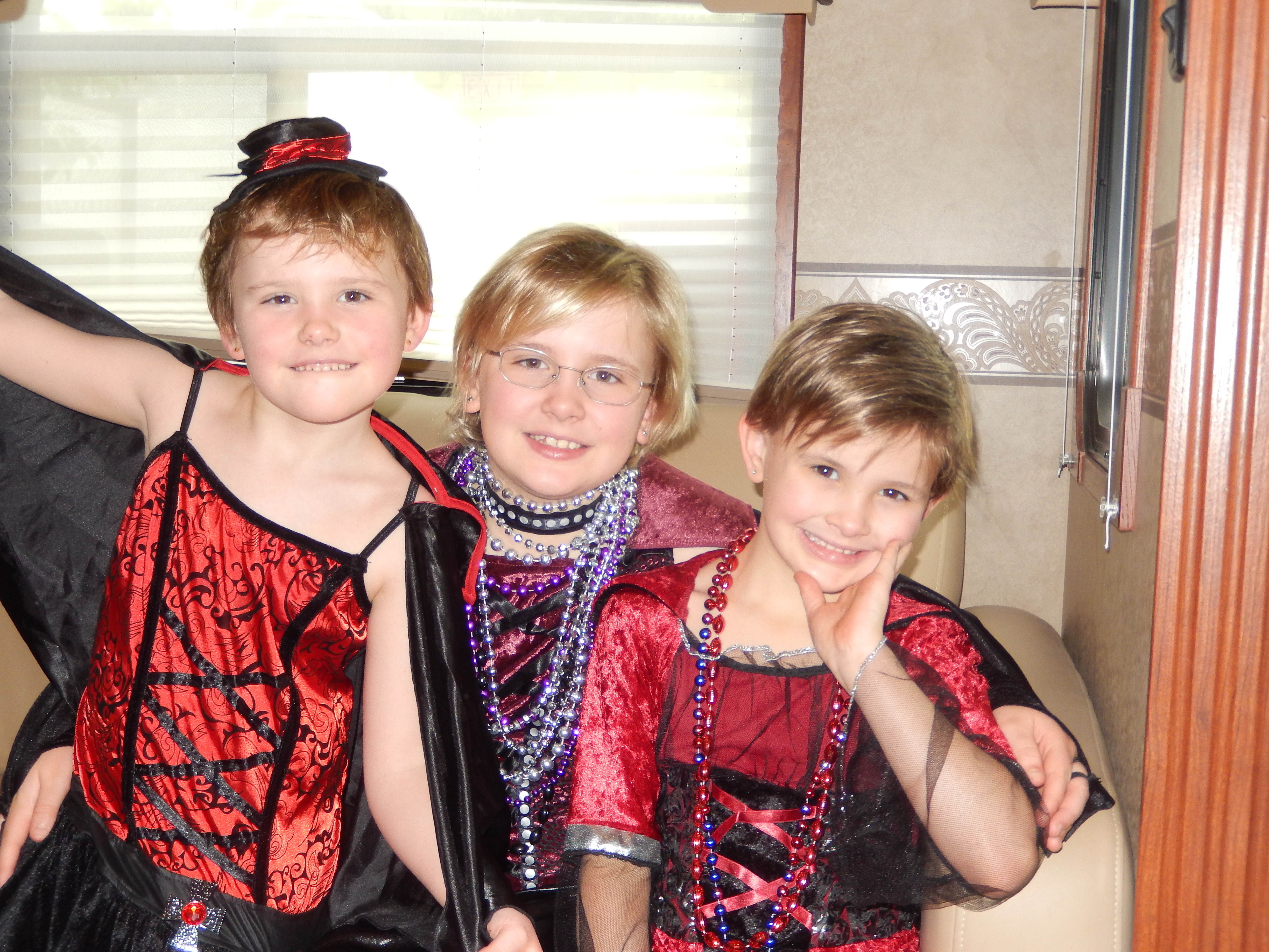 us in the campground on the weekends, when they didn’t have school. They were a joy to have around. I think one of their favorite activities is “dress up,” with some Halloween dresses we bought a couple of years ago. We would play at the local parks, the playground and pool at the campground. They enjoyed helping Pat with meals and going geocaching with me. We spent a lot of time finding geocaches in the area, often combining our caching with a bike ride. Sometimes they had the sharpest eyes and found the cache before I could.
