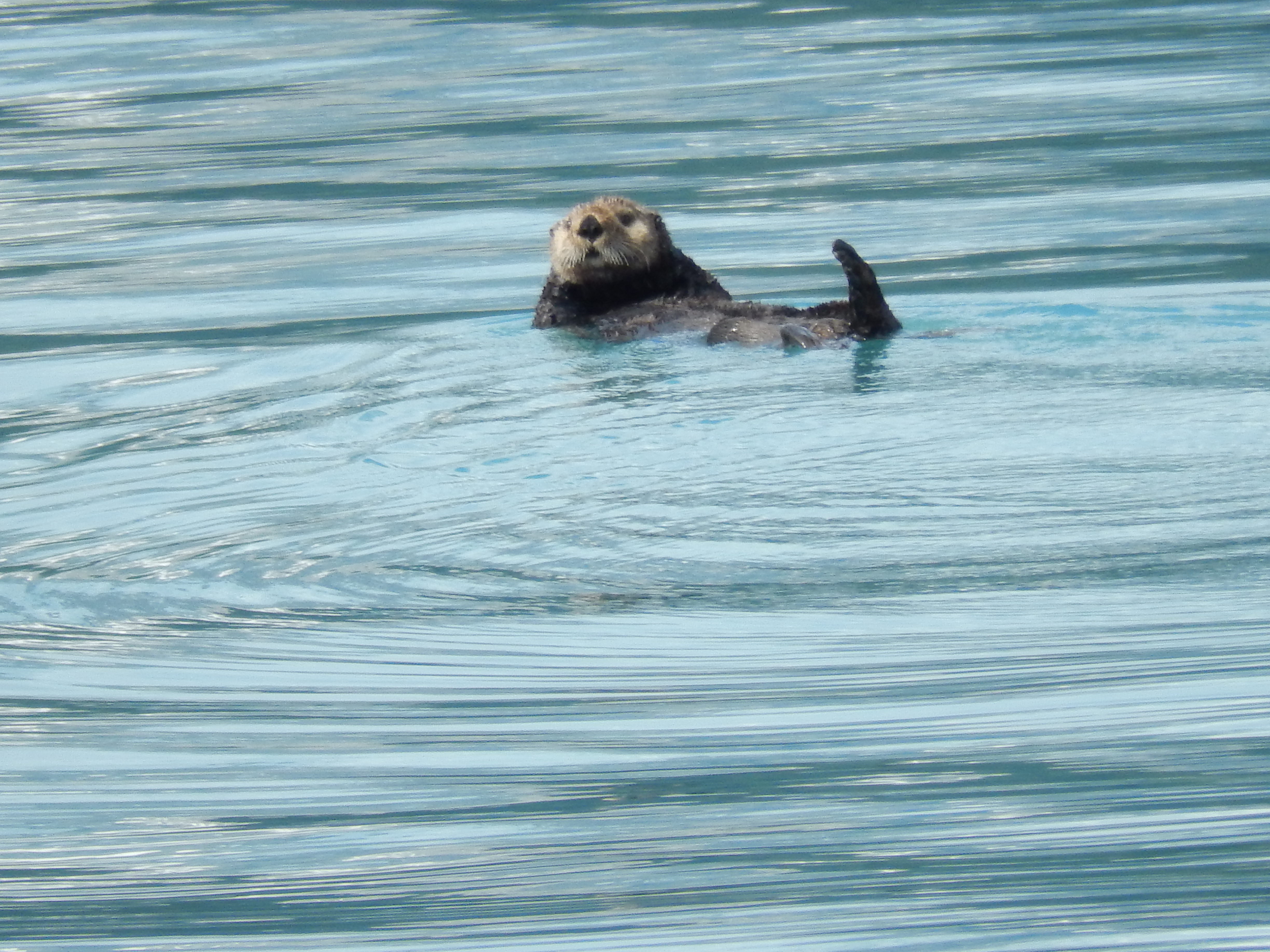 About 5:00 we arrived at the other trailhead for the Grace Ridge Trail, where we had made arrangements for the water taxi to pick us up. There were a trio of ladies camping in a State Park Yurt doing landscape painting and we had a nice chat with them. A couple of hikers were there and glad to hear we had a water taxi coming, because they had not arranged for one. The taxi arrived about 6:30 and we made a quick return to the small boat harbor on the “Spit.” Although we didn’t see any sea otters in Tutka Bay, we did see one playing in the harbor.