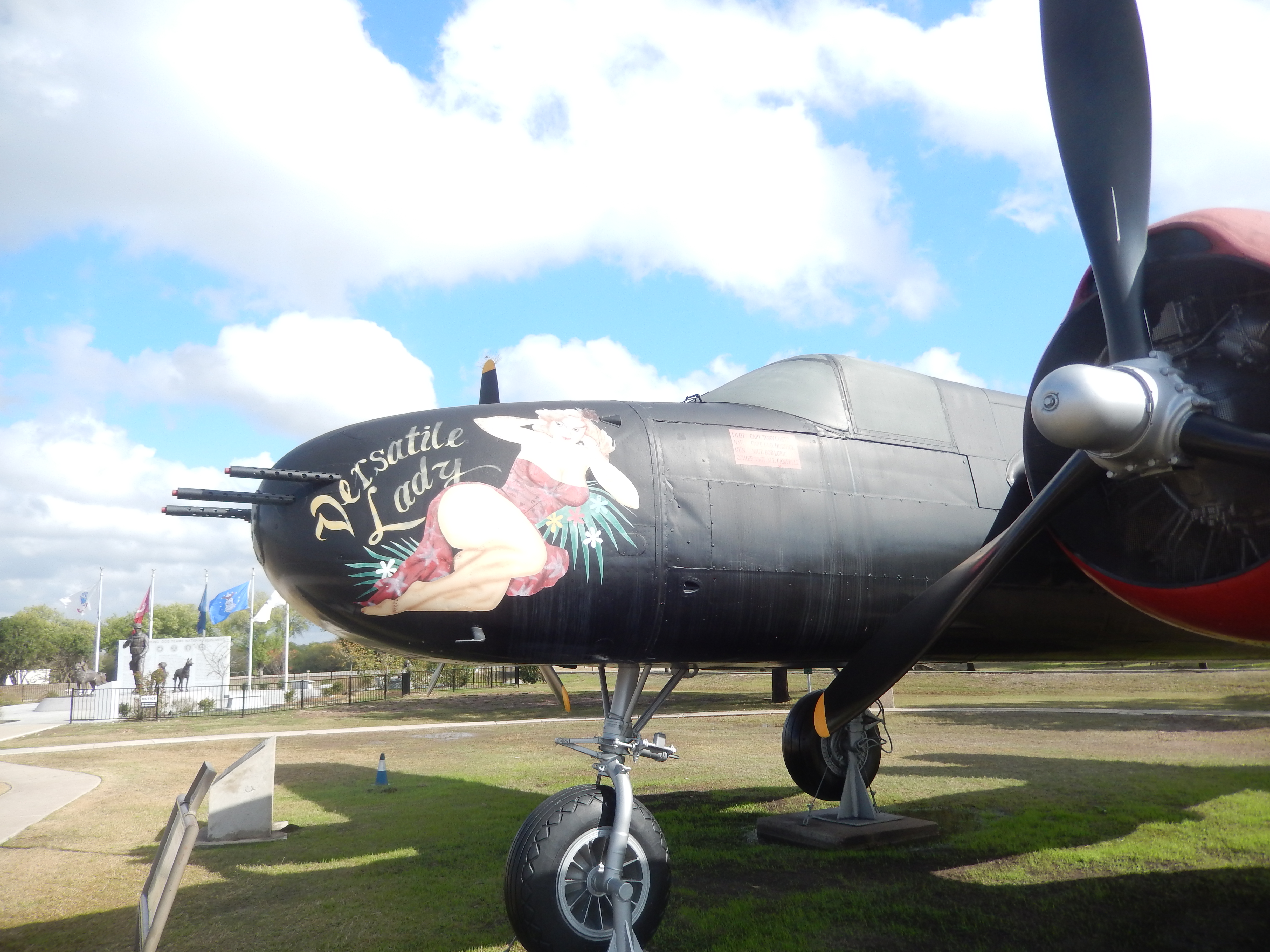 Lackland is where the Air Force conducts basic training. The parade field is surrounded by vintage aircraft. I wandered by the aircraft and thought the “nose art,” pictures the crew would paint of the nose of the aircraft, fascinating. I don’t think this is allowed anymore and that’s a shame.