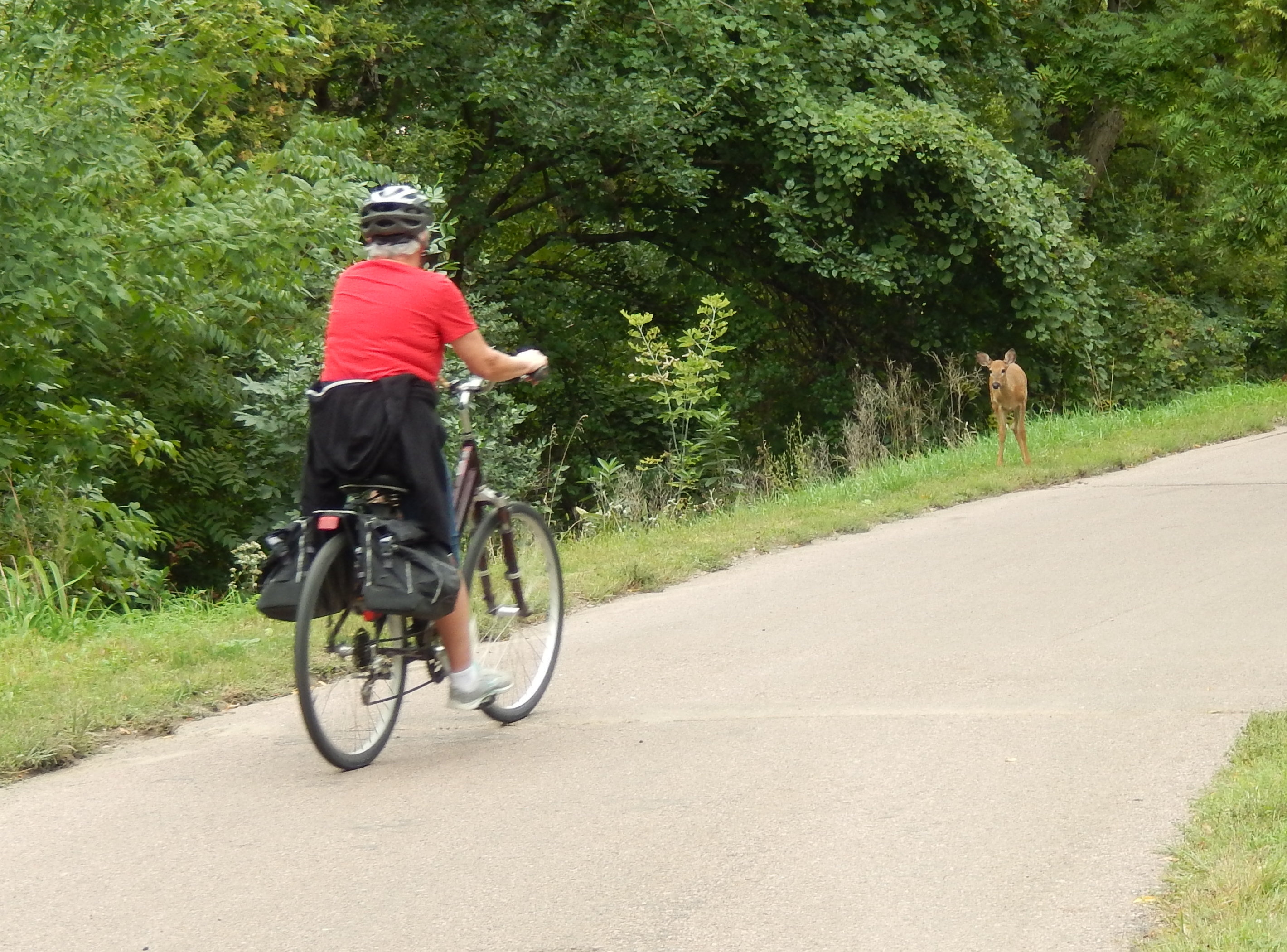 Sioux Falls has a loop bicycle trail that starts at Falls Park. We rode the trail that led us along the river and past a series of parks. Even though this was a Monday, there were many other people biking, walking, or running on the trail. We also shared the trail with some deer that were very comfortable being around people. Part of the trail ran along the top of a levee that is part of the Army Corps of Engineers flood control program. As we rode along I spotted several flood gates that would release water into low laying areas if the water threatened to top the levee, as well as dams that would hold water back during times of high water. If you want to avoid some steep uphill climbs, ride the trail in a clockwise direction.