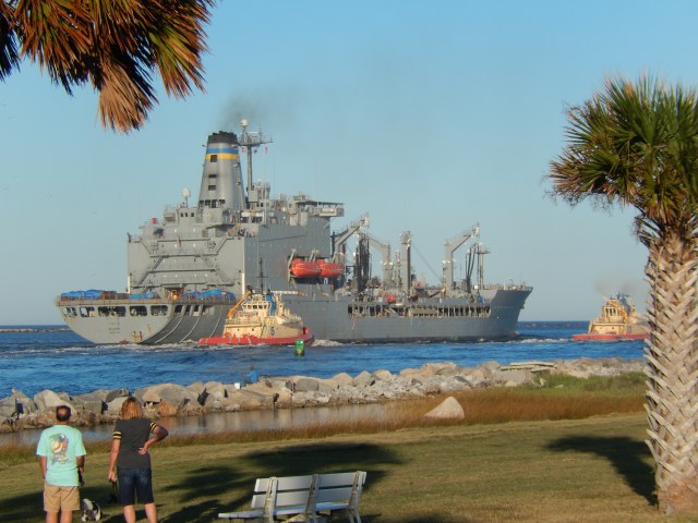 We took the next day to take care of some house-keeping chores – washing the trailer and taking advantage of free washers and dryers in the park laundry. One of the benefits of staying here is that you are right on the St. Johns River and can watch the ships as they go by – Navy ships from Mayport Naval Base and commercial vessels from the commercial ports up river.