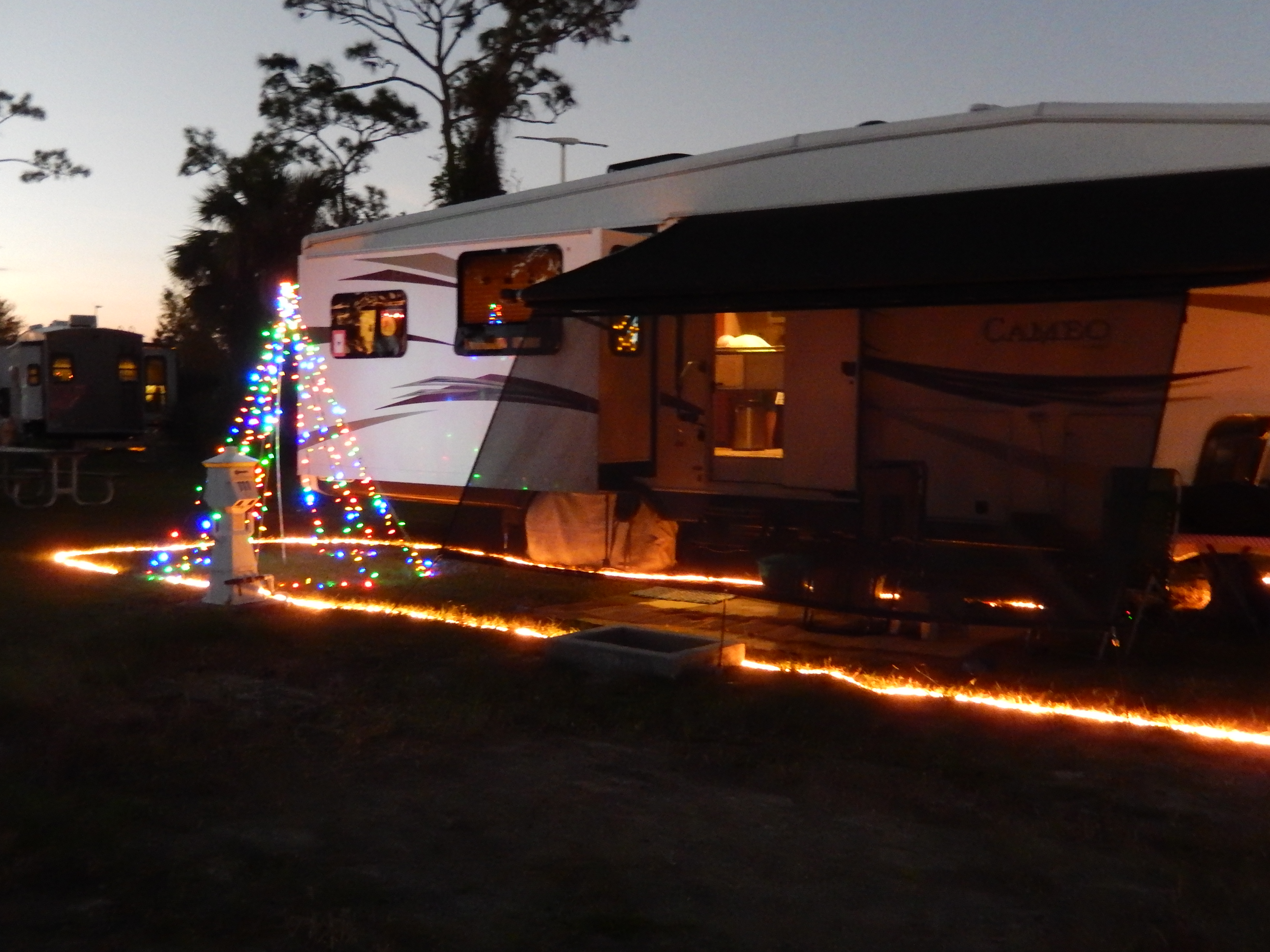 We may not be in snow country, but we still decorate for the holidays. We drape ornaments from the crown moldings of our trailer’s slideout rooms. I decorate the small tree that my mom sent to me when I was deployed in the Persian Gulf for Desert Shield and Desert Storm. We hang lights in our windows and I make a tree of lights outside. Pat says it is hard to really get into the Christmas spirit when you have the air conditioning running while you are decorating! As we walked around the campground it was interesting to see how others had decorated their RVs for the season.