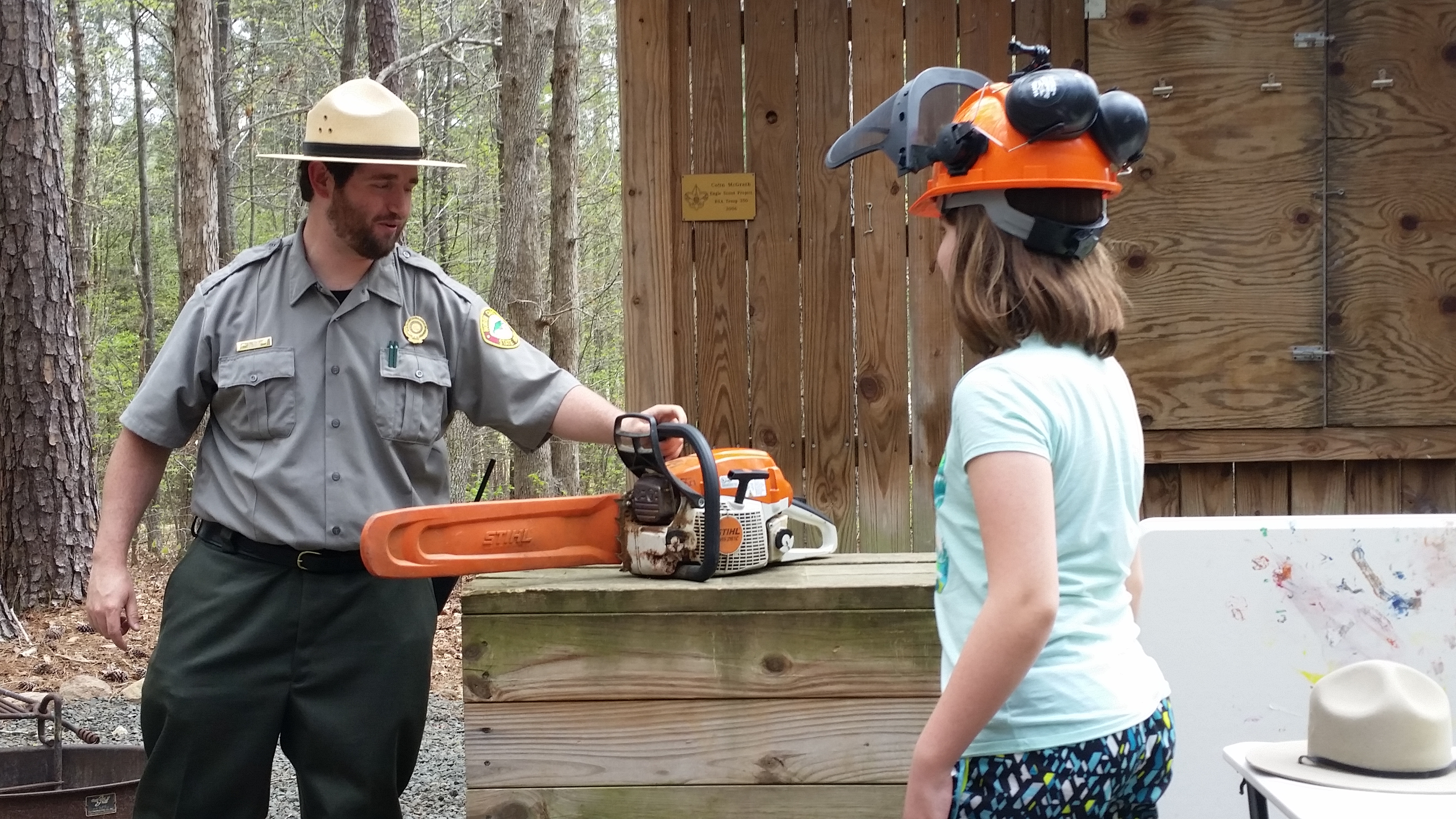 The Ranger staff presents programs throughout the camping season and I was able to attend one that was held at Holly Point on a “day in the life of a Ranger.” It was informative and well done. The kids attending really enjoyed trying on the various hats/helmets worn by Rangers in the performance of their duties.