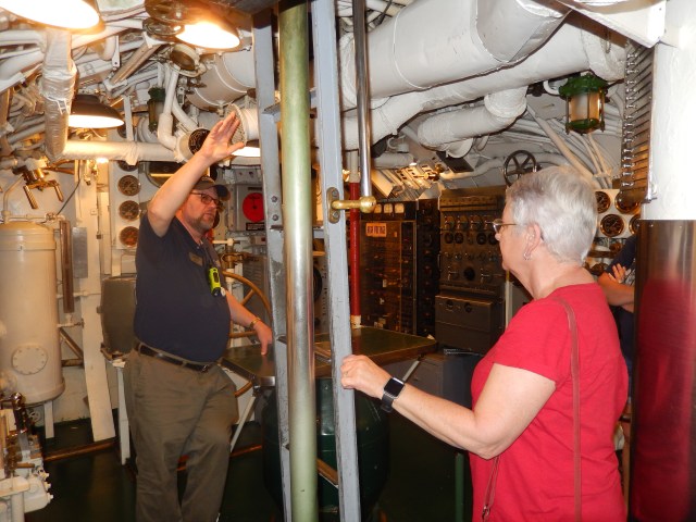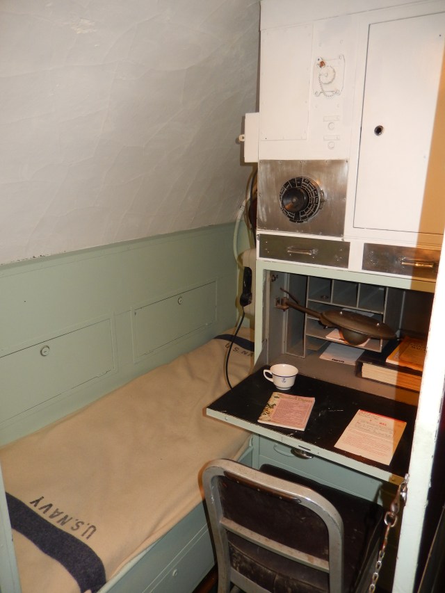 Pat, her sister, Mary Lee, and I started our tour in the forward torpedo room and moved aft (towards the rear). The Captain’s cabin was the roomiest berth in the submarine – I wouldn’t call this roomy.