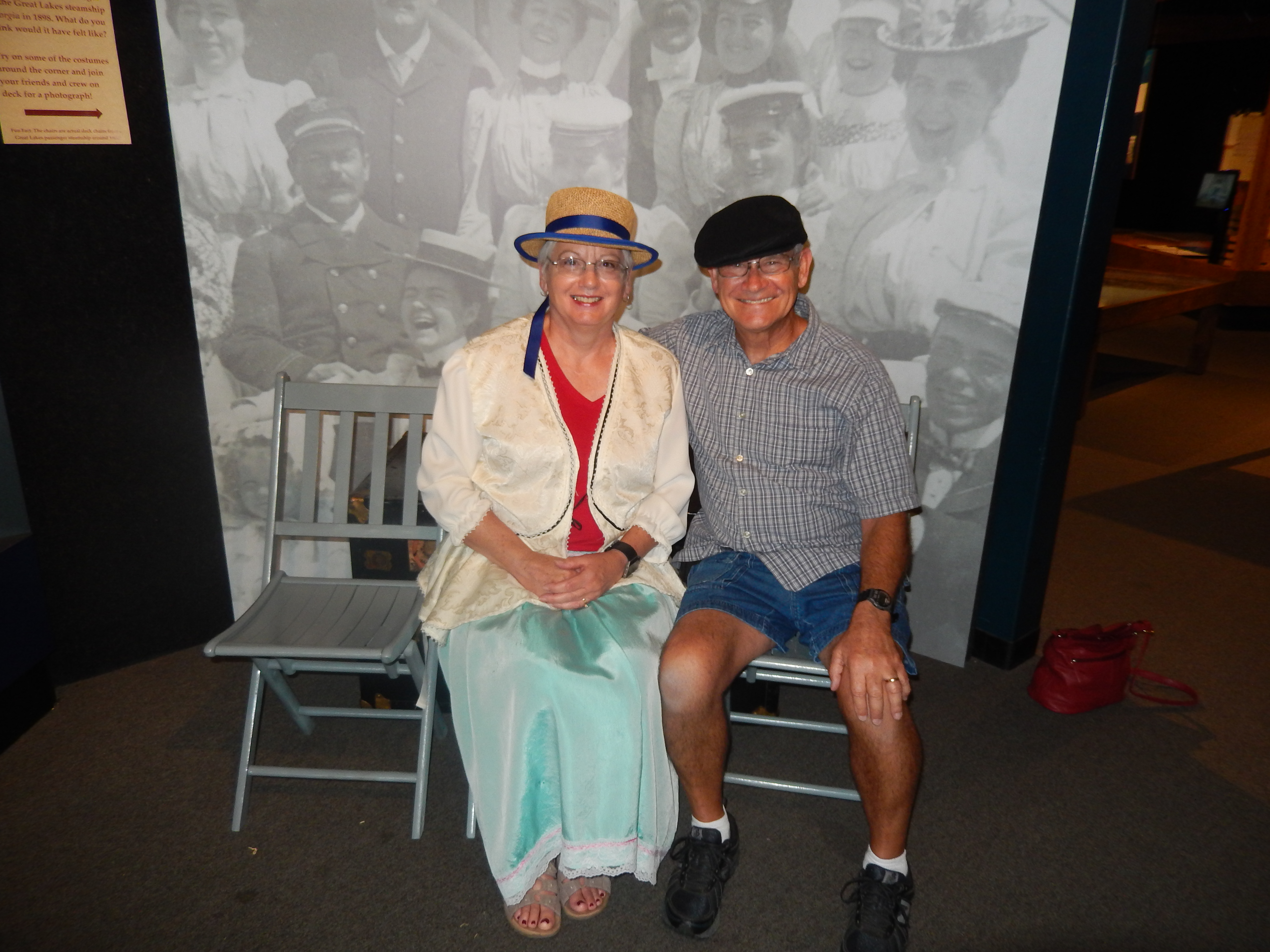 One of the displays gave us the opportunity to dress up in period clothing for a picture on the deck of a Great Lakes steamer. Unfortunately the exhibit was intended for children, while Pat was able to find clothes that fit, the only thing that would fit me was a hat.