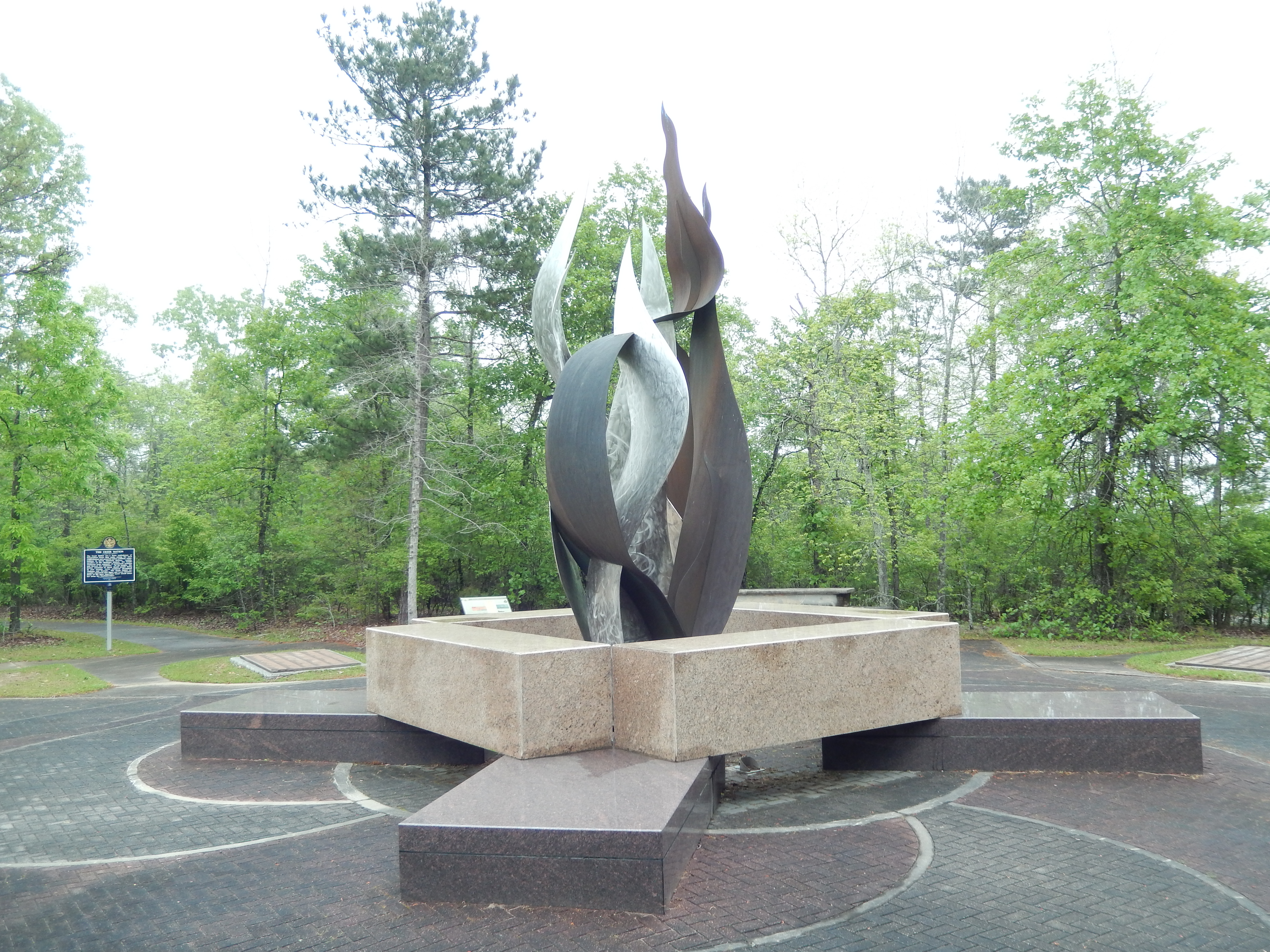 One of the sad parts of Fort Mitchell’s history is that it was a gathering place for the Seminole Indians for the beginning of the Trail of Tears, the forced migration of the Indians from their ancestral lands to the frontier, west of the Mississippi River. As we read the story of this, I couldn’t help but think the United States has plenty to be proud of, but also has reasons to be ashamed. The day was overcast with drizzling rain. Perfect, somber weather for such a visit. The metal flame sculpture honors the memory of the Indians who were driven from their lands.