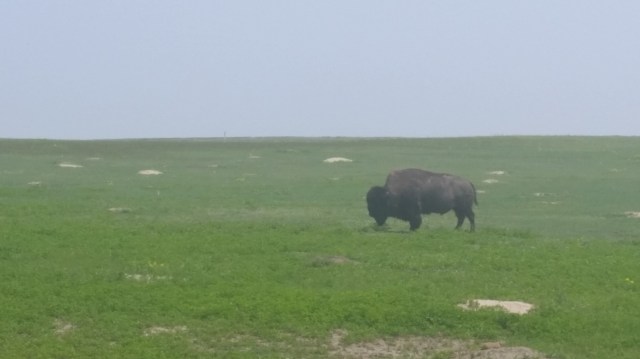 We stopped in Box Elder, SD and stayed at Ellsworth Air Force Base in their FAMCAMP (Family Camp/RV Park). It’s a nice place to stay with full hookups and FREE laundry. We drove over to Americas Mailbox to pick up our mail, but generally just relaxed On our way to Ellsworth we took a detour to drive through the Badlands National Park. It’s amazing to me to look out over this huge basin and realize this was once a huge inland sea until the Rocky Mountains erupted and caused this sea to drain into the Pacific Ocean. They have found fossils of all sorts of aquatic life in the area, but today we saw bison.