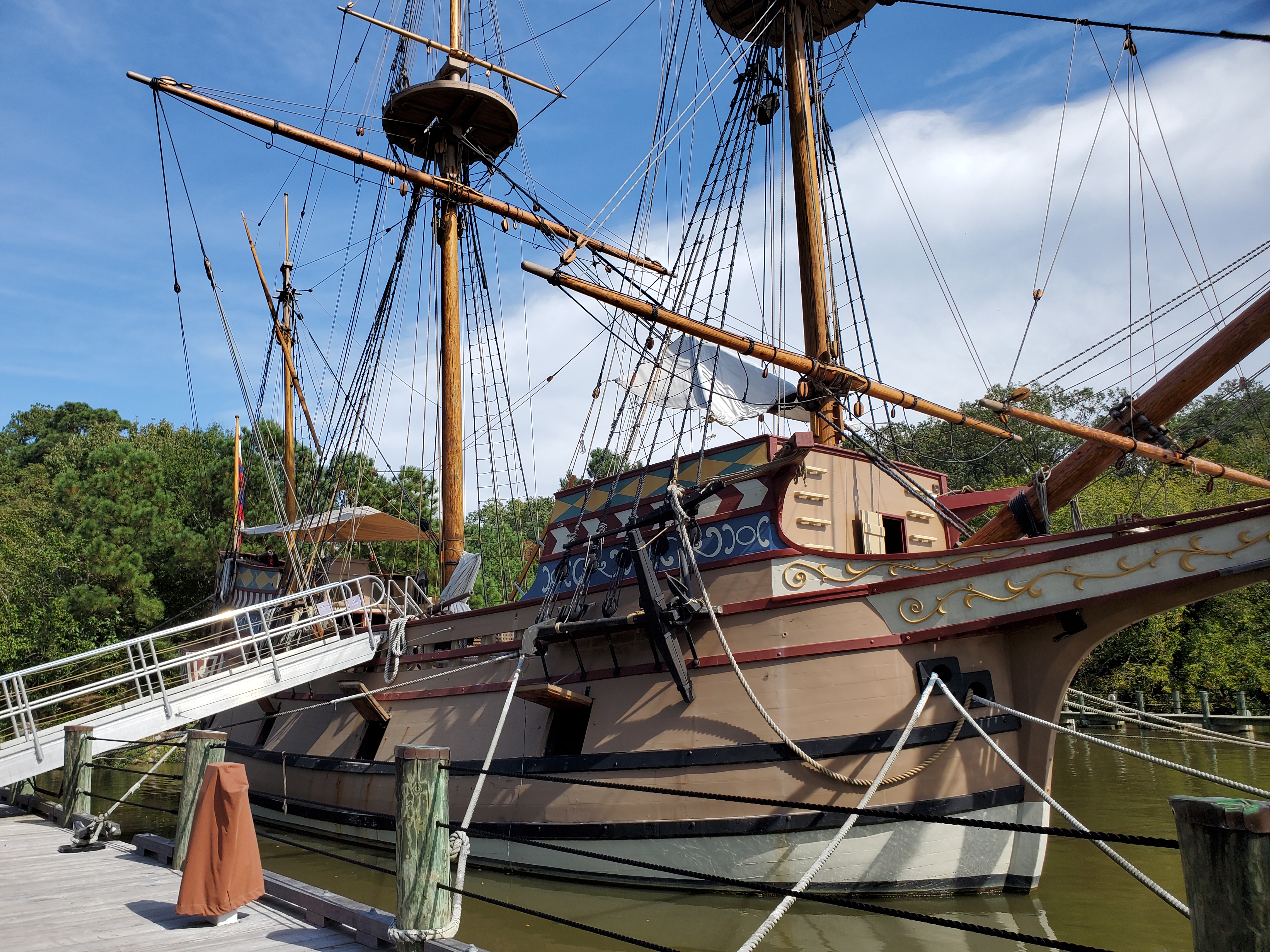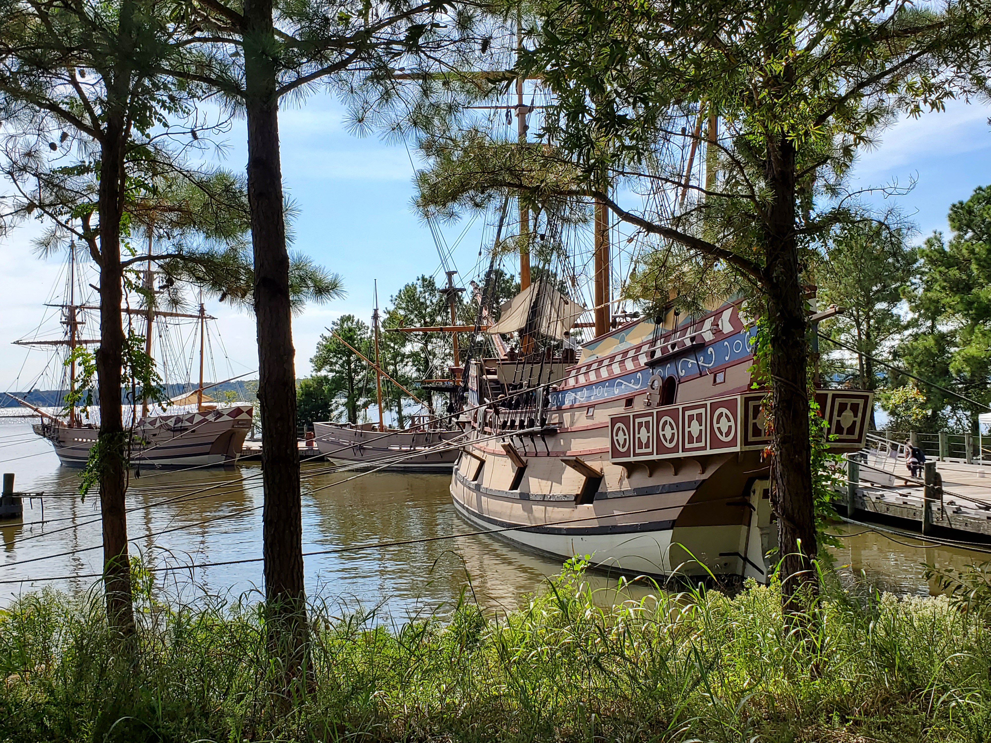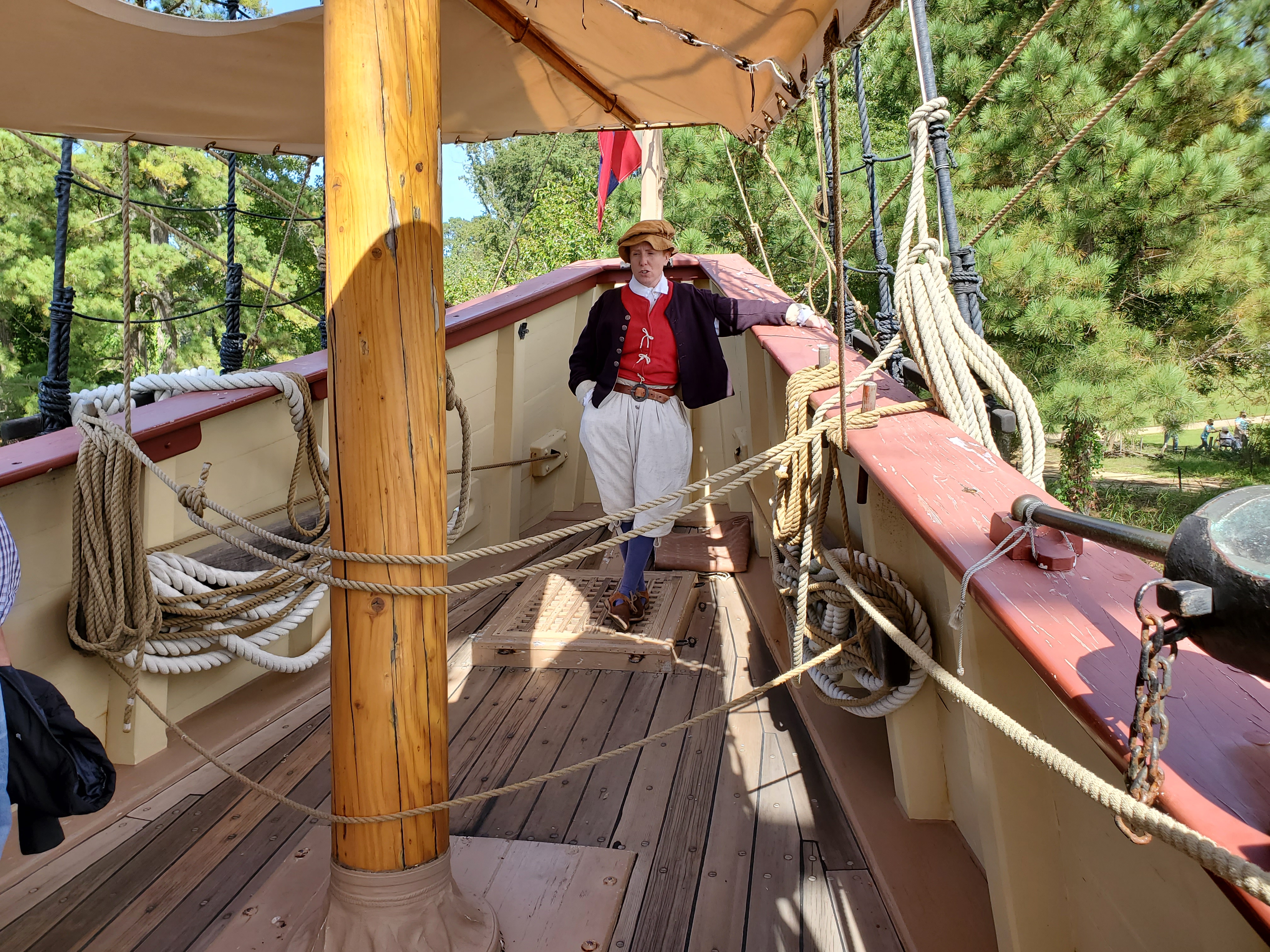 Next stop was the Jamestown Wharf. Here we were able to board and explore a replica of the Susan Constant, one of the three ships the original Jamestown settlers traveled aboard from England. A new fact I learned was that the passengers were considered cargo and had no living quarters. They would eat and sleep on the exposed deck or wedged in among the casks and bundles of the non-human cargo. I can’t imagine how much fun a cross-Atlantic voyage would have been in those conditions!