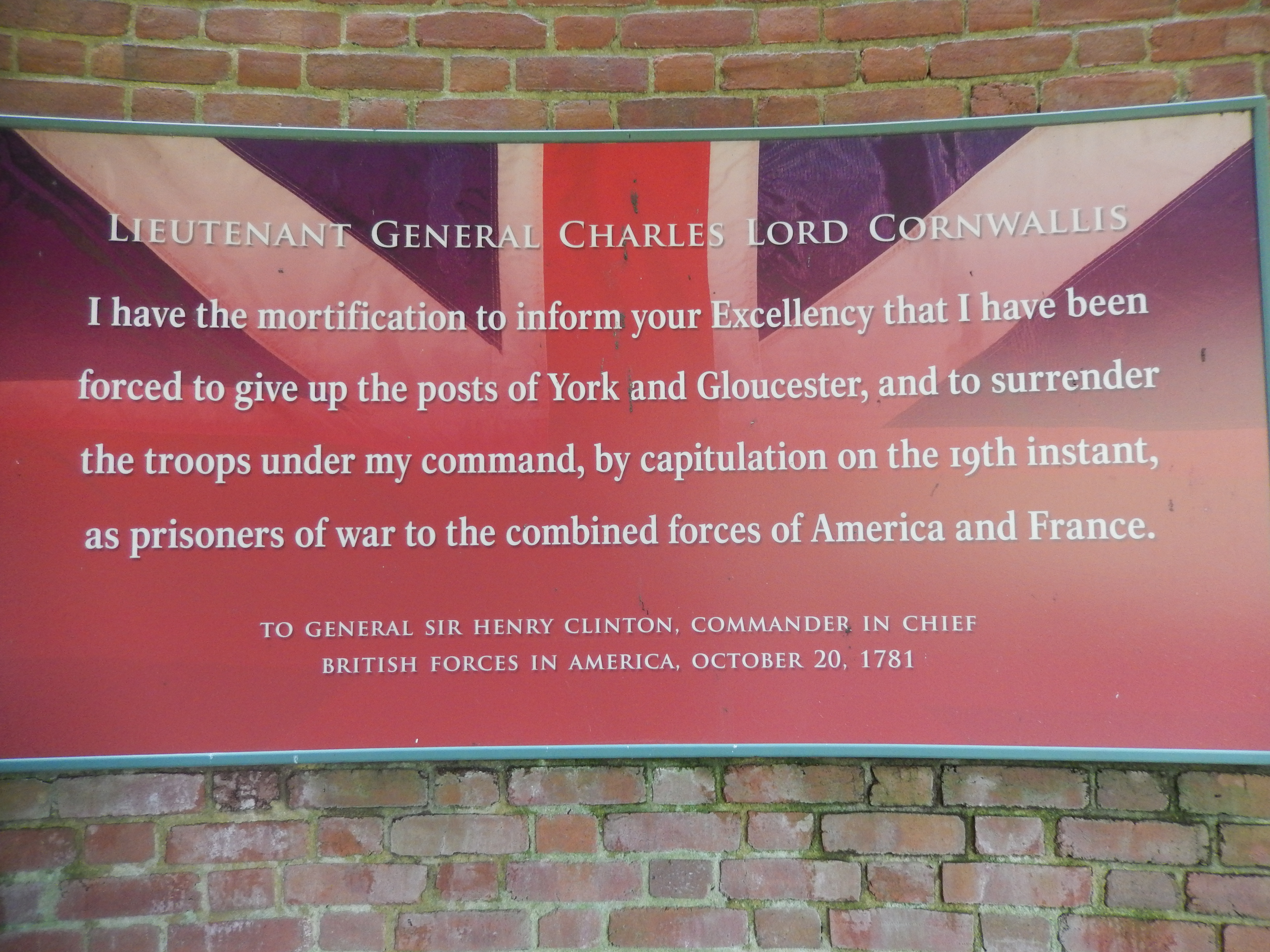 After the Battlefield Tour we parked and walked around Yorktown. It’s a small, quiet community and it made me wonder what it must be like to live in a “living museum.” We visited the Yorktown Victory Monument. On October 24, 1781, LTC Tilghman, Washington’s Aide de Camp, reached Philadelphia and advised the Continental Congress of Washington’s victory at Yorktown. Five days later the Congress authorized the construction of the Victory Monument. It was to be, “a marble column, adorned with emblems of the alliance between the United States and his Most Christian Majesty.” However, the monument was not constructed until 100 years later. This should have been an early warning to anyone who expected the government to act quickly on anything.