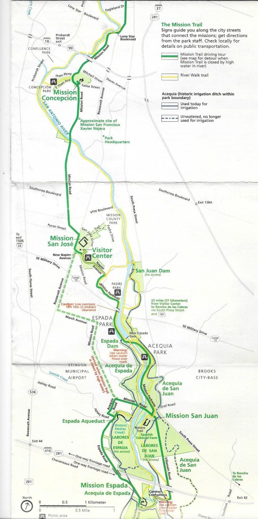 Later in the week we decided to ride the San Antonio River Trail to tour the San Antonio Missions National Historical Park. In the 1700s Franciscan monks (members of the Order of Saint Francis of Assisi) established a chain of missions along the San Antonio River. The mission system sought to bring Indians into the Spanish society and the Christian faith. Financed by the Spanish Crown, the missions served both the church and state. The missions became communities for native Indian tribes and centers of commerce. They were also military posts, protecting the mission communities from marauding Indian tribes of Apache and Comanche. All of the missions shared common designs in that they were surrounded by a wall to protect them from Indian attack, a central area that served as a trading center, a church with lodging for the Franciscan monks.