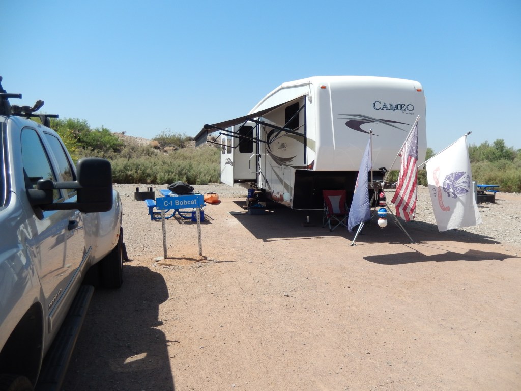 On our fourth day the winds were low again and we launched our kayaks from a small beach a few sites away from our own. As we paddled around the island, we saw the ferry to the California side of the Colorado River. There was a lot of boat traffic on the lake, including many “cigarette boats” that didn’t believe in mufflers. You could hear them coming a long way off. It was a longer paddle than we planned on, but quite interesting. At one spot, we pulled in for a short rest. The local groups are doing their best to keep the area clean. They provide stands with large trash bags to prevent littering. It was pretty sad that I was able to almost fill one bag with trash that included two other partially filled bags that had been left behind. Ours ended up in a dumpster.