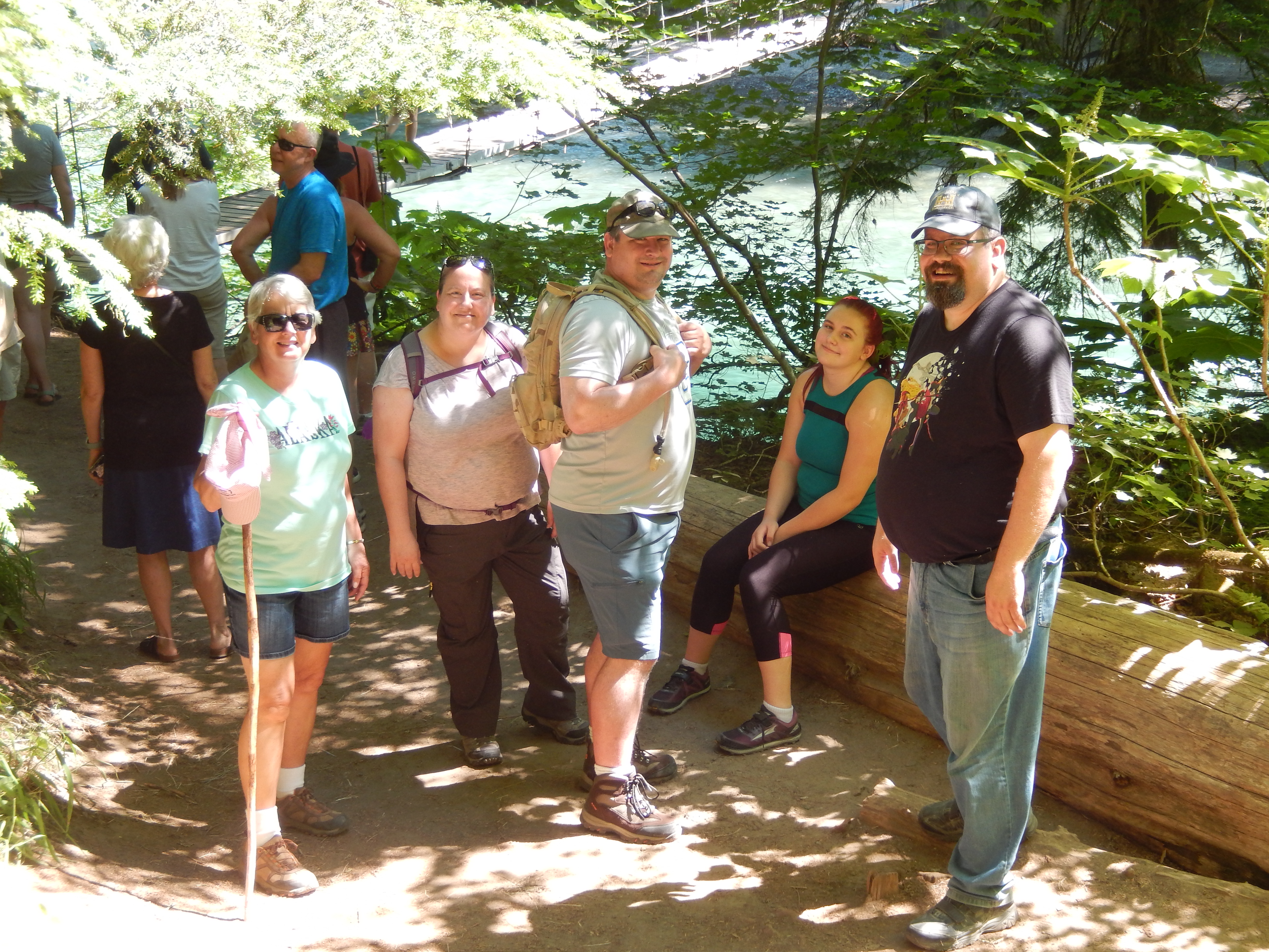 Scott, and his oldest daughter, Katrina, joined the rest of us (Elisabeth, Dave, Pat and I) to travel to Mount Rainer to hike some of the trails. Our first stop was the Grove of the Patriarchs. This is a small island of HUGE trees. Some are more the 40 feet in diameter and over 300 feet tall. The trail led us to a suspension bridge across the river to the Grove. The National Park Service has limited the bridge to one person at a time. With traffic going in both directions there was quite a wait before we could cross. As I crossed the bridge I recognized the wisdom of this limitation, the bridge was very wiggly as we crossed!
