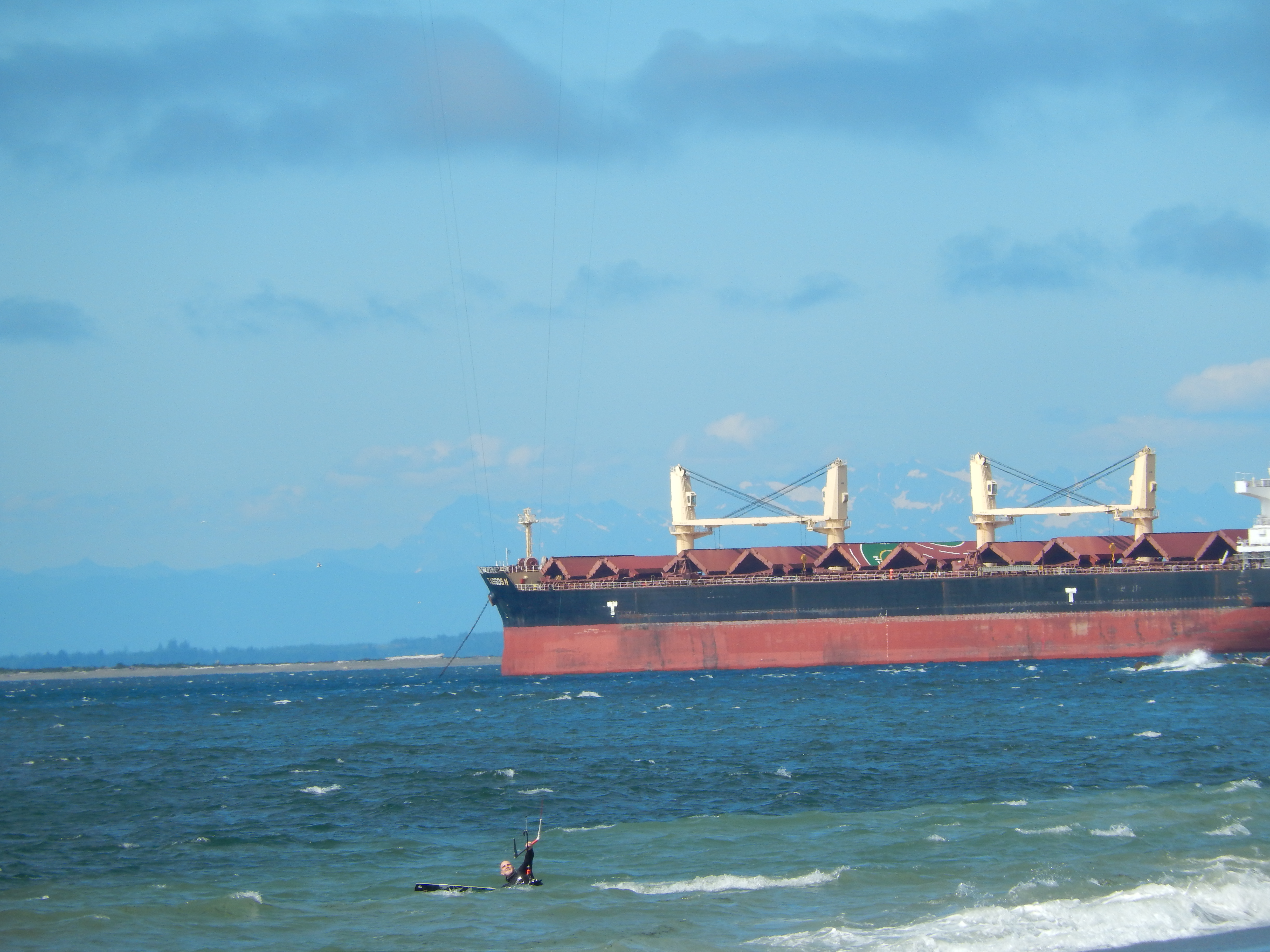 There was an unloaded freighter riding at anchor in the bay, but the big attraction was a kite-boarder. We watched him preparing his rig on the beach and then heading downwind. Even though he was wearing a wetsuit, he still looked COLD!