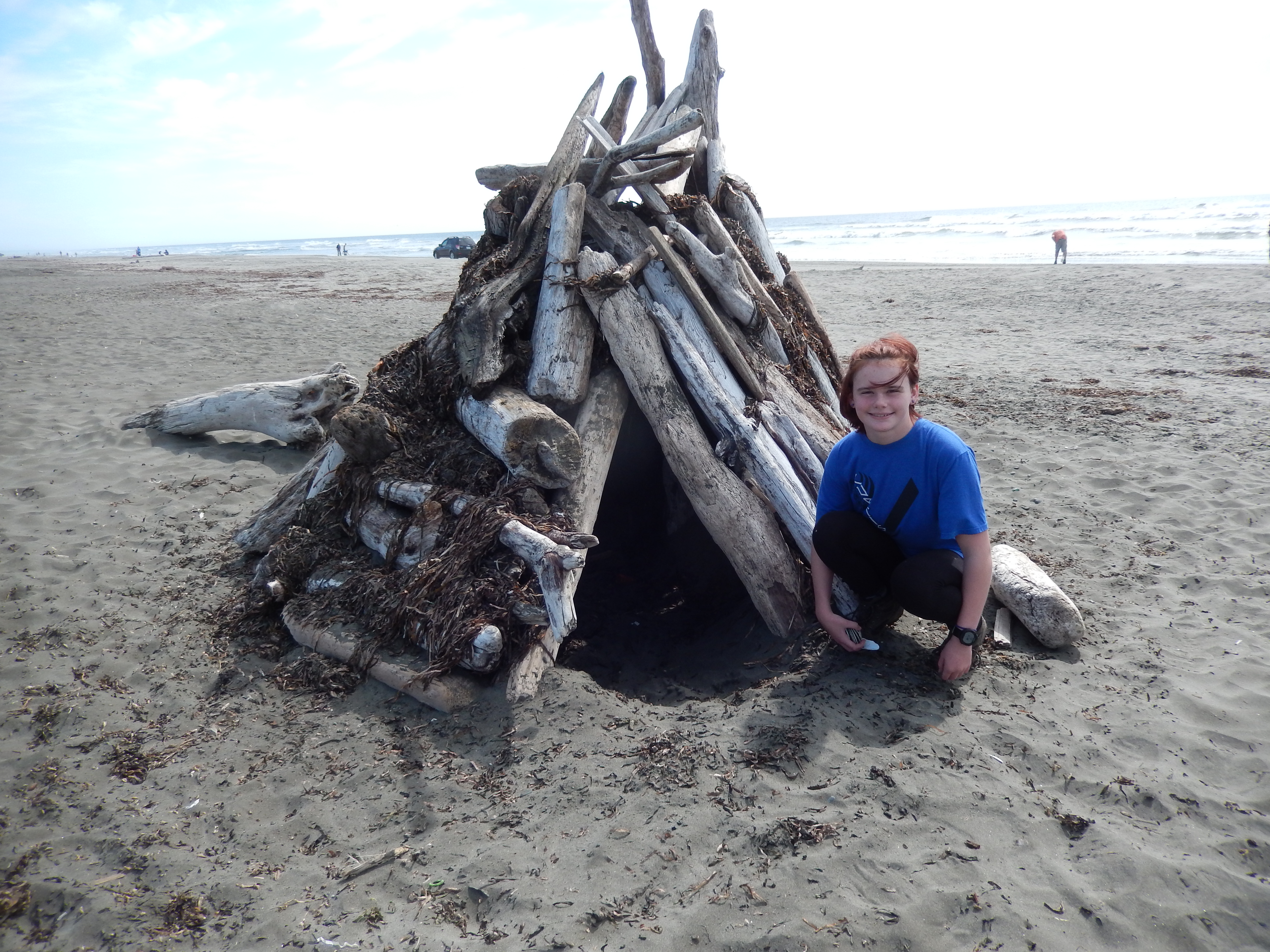 One afternoon, Pat, Elisabeth, granddaughter Sierra, and I hiked some of the trails at Twin Harbors State Park. There is a good-sized network of trails in the park. They pass by some of the campground, the inner dune zone, and onto the beach. The beaches in Washington are busy places. You can expect to see picnickers, clammers (people digging for clams), vehicles driving on the beach, and surfers. Making makeshift shelters from driftwood is also a popular activity.