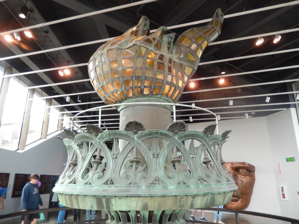 From the 911 Memorial, we walked to Battery Park to board the tour ferry to the Statue of Liberty and Ellis Island. The National Park Service is in the process of moving the museum displays from the base of the monument to a separate museum building. Because you need to purchase a separate pass to go to the top of the pedestal, there wasn’t any crowd at all in old museum. It was interesting to see how the statue was developed and constructed and the timeline for it all. From the top of the pedestal, we had great views across the Upper Bay and Lower Manhattan. At one time, it was possible to climb interior stairs to the head of the Statue, but those days are long gone. After we toured the new museum (kind of a letdown after seeing the old one), we re-boarded the ferry to go to Ellis Island. What I liked best about the new museum is that the original torch is on display.