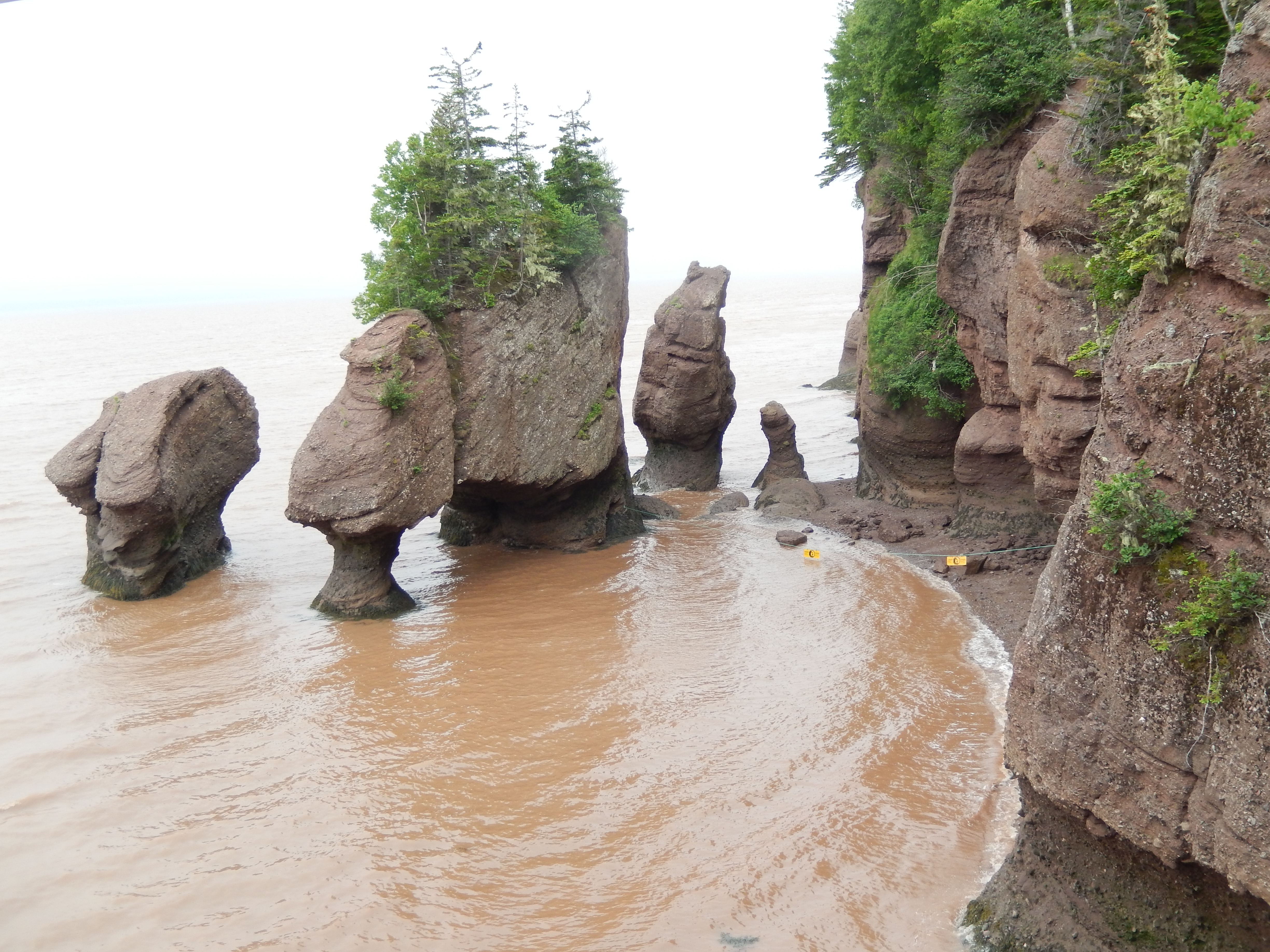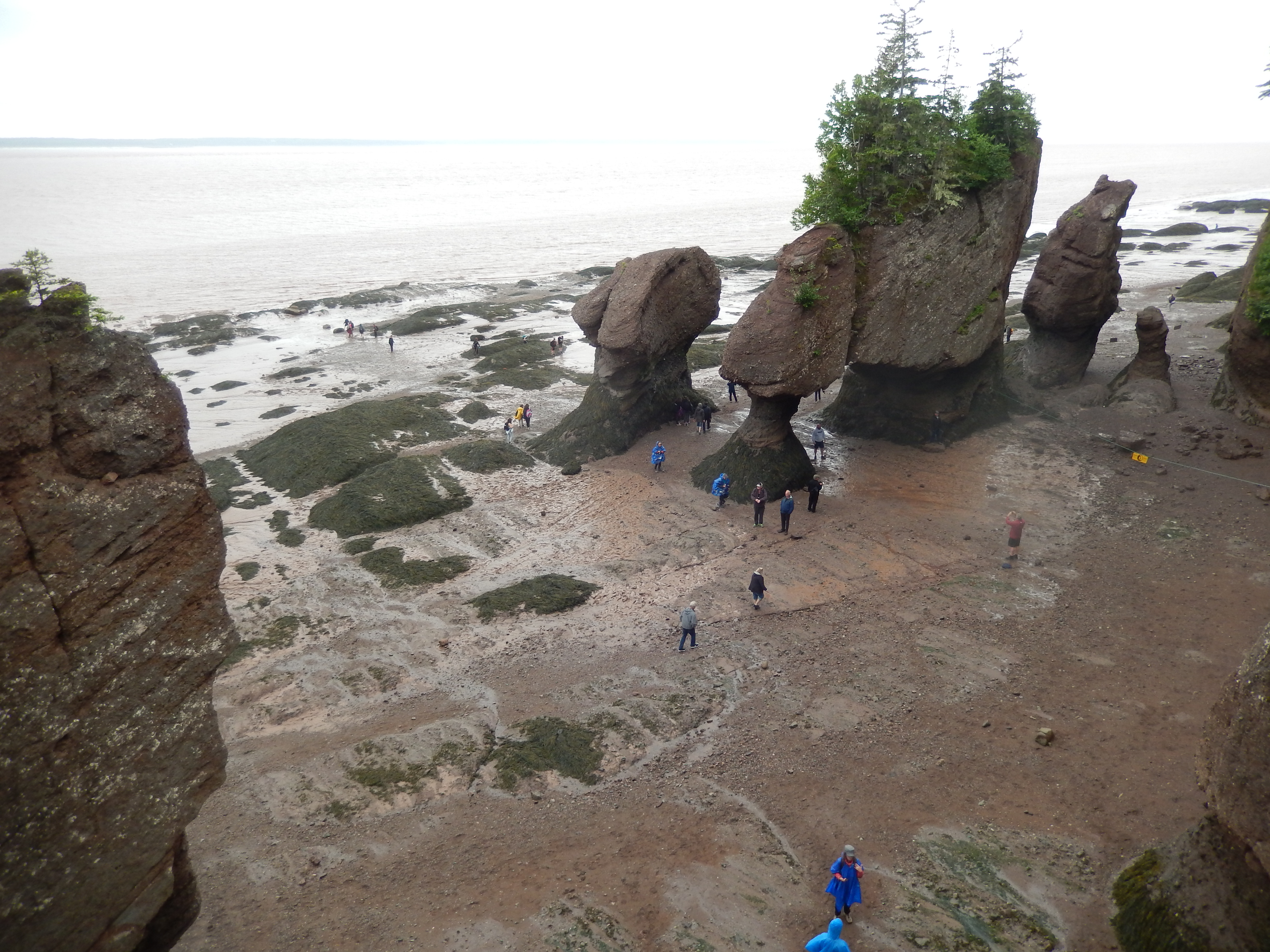 On Friday, we drove to Hopewell Rocks Provincial Park. There we were met by a park ranger, Ada, who gave us a tour of the ocean floor. As we walked on the beach, we were told that at high tide the ocean surface would be about thirty to forty feet above us. Ada described how the seaweed we saw didn’t grow from the sand and mud but directly from the rocks on the floor. The mud flats that were farther out in the bay provide a food source for migratory Sandpipers. Clams and other such crustaceans don’t do well because the tides are so severe. We went to the visitor center where she showed us a time-lapsed video of the tide change. After that Pat and I had some lunch and went back to see the beach and saw the difference and how much faster the tide was changing here, compared to St John and Alma.