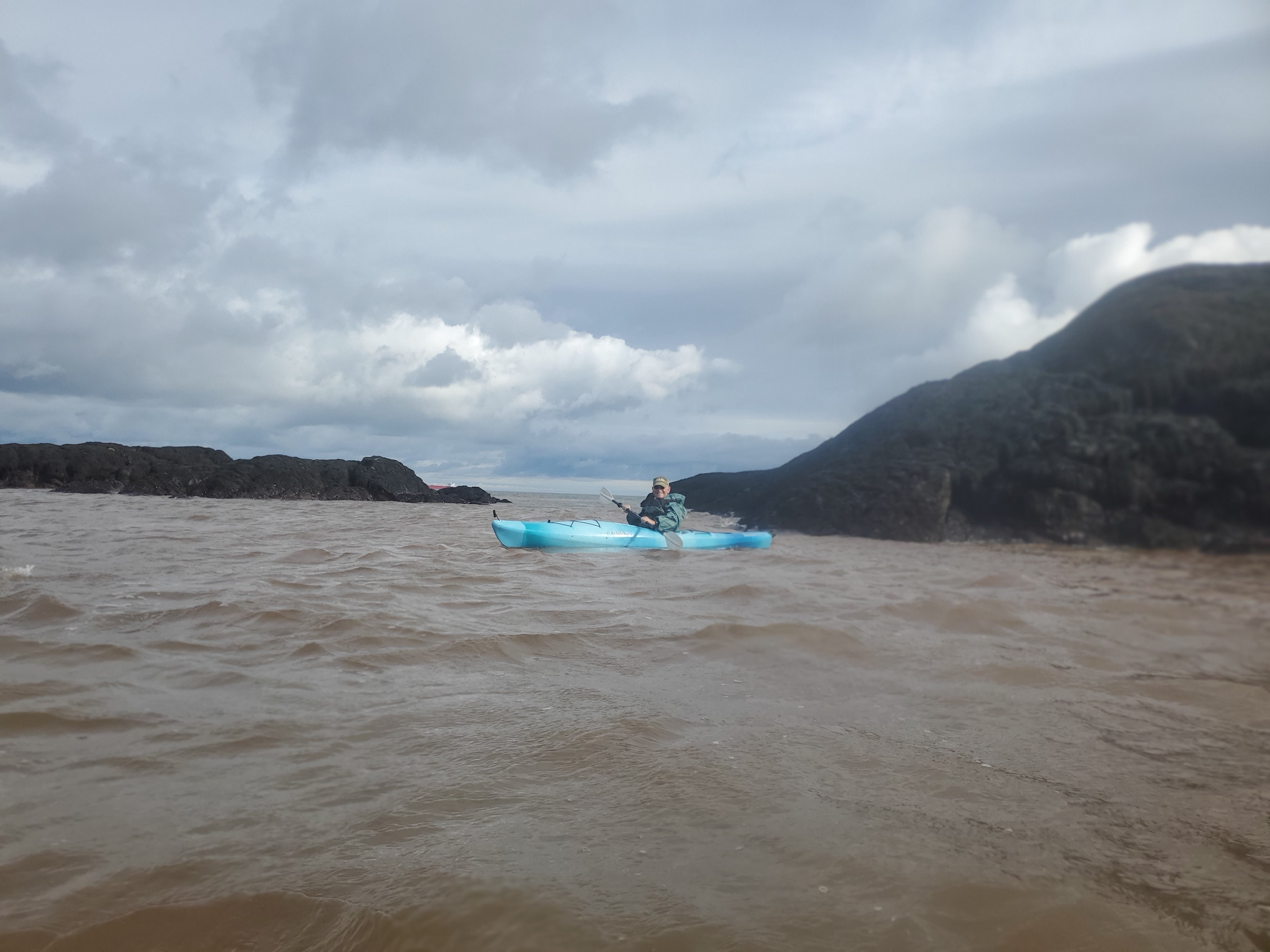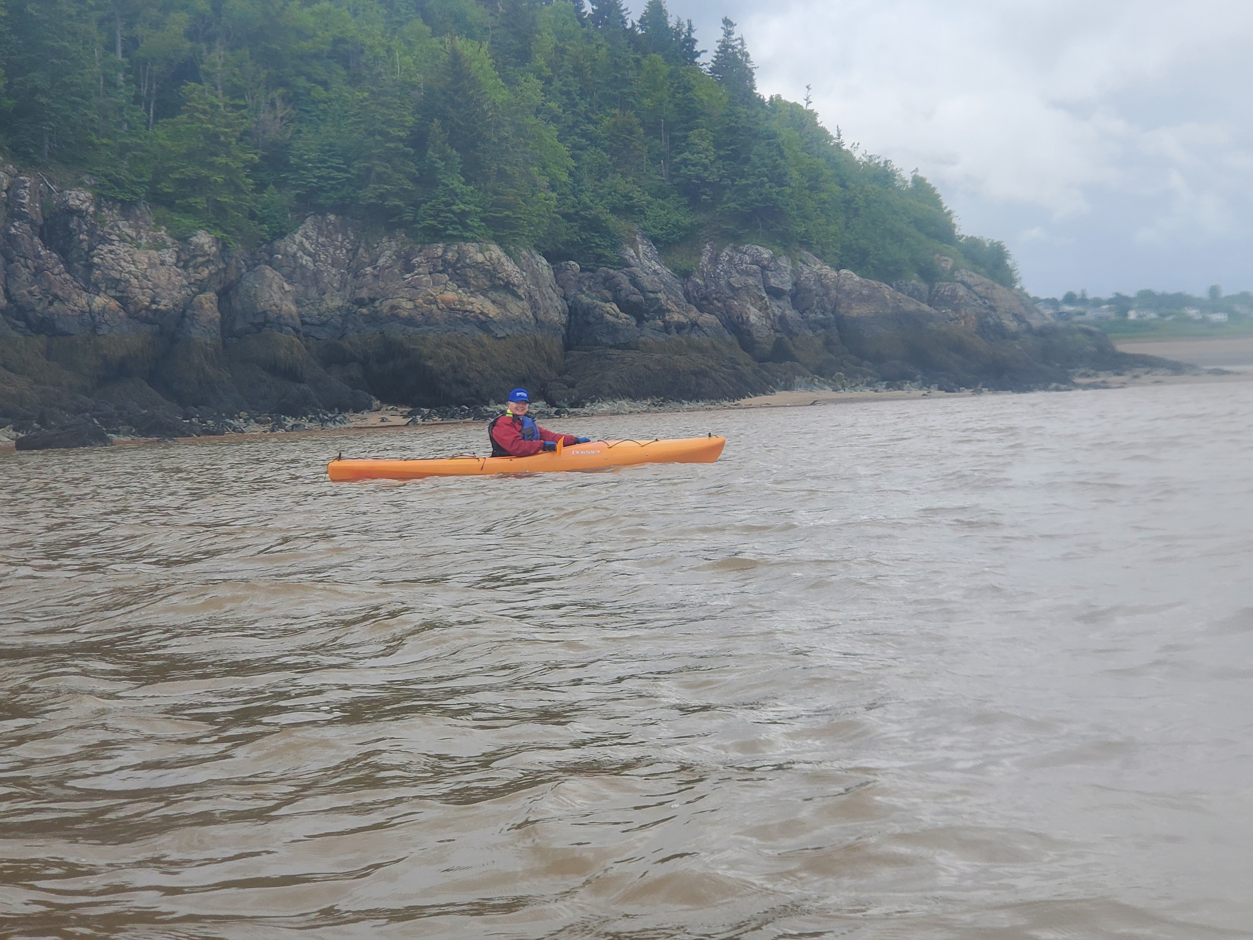 One of our goals was to kayak in the Bay of Fundy. We had kayaked in Kachemak Bay in Homer, AK, which has the second highest tidal change in the world. The Bay of Fundy has the highest and we wanted to paddle there as well. We contacted a local kayaking shop and the owner gave us some great advice as to where we would be able to launch and have a good paddle. After an afternoon of off and on rain, we launched about an hour before low tide from the Irving Nature Area. We rode the tide out, and we had a light tailwind. We explored the area below some cliffs where we compared where we were in relation to the high water marks. They were easily twenty-five feet or more above us. We turned toward the shore and felt little to no tide. I think what incoming tide we had was canceled by the headwinds. We were rained on for about ten minutes but that passed before we made it to the beach.