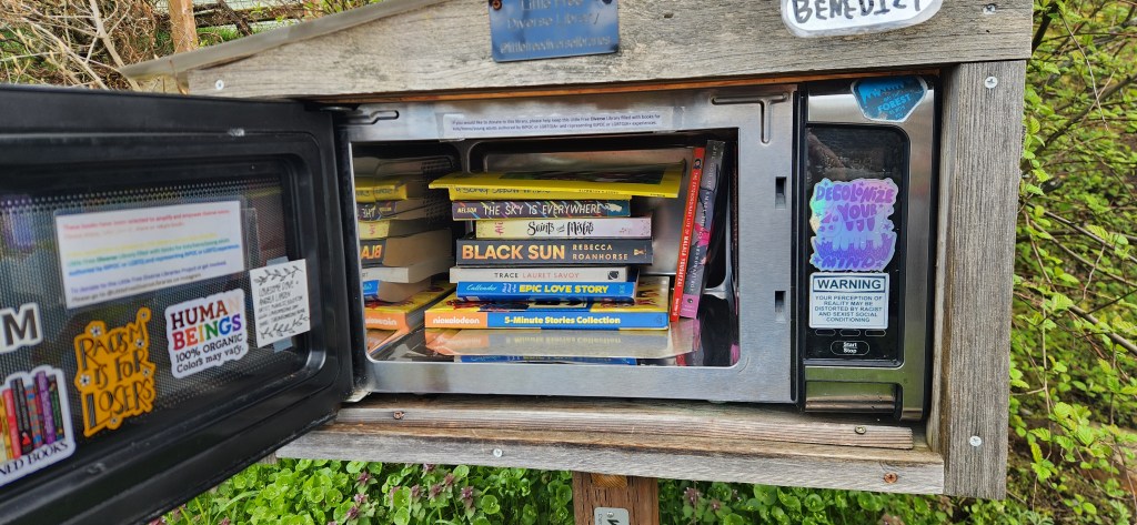 This one looked like it was a residential mailbox, but when I opened it I found this. I’m not really sure why they looked it was a good idea to camouflage a free library, but . . . . .