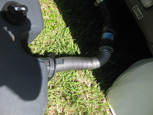 Normally if you stay in a campground for a few days, you can dump your black water (toilet) and grey water (sink & shower) waste tanks at a dumping station on your way out of the park. However, if you are boondocking for an extended period you normally don’t want to hitch up your trailer and set up all over again. We bought a portable waste tank, often called a “blue boy” because most of them are blue, although ours is grey and Bob calls it the “honey wagon.” You dump your waste tanks into the honey wagon, tow it with your pick up to the dumping station. It takes Bob 2-3 trips for each tank, first black water then grey so the grey water would flush all the black water waste out of the honey wagon. It’s a good idea to add a clear section on your waste line to see when dumping the waste tank is finished. You should NEVER dump grey water on the ground. All waste should be disposed of at authorized dump stations.