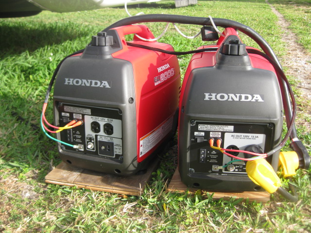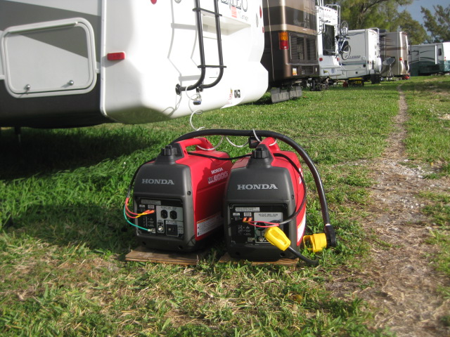 If there is no post to plug into, then you have to provide your own and that means a generator. Just any generator won’t do. Commercial generators like you buy in a hardware store for powering tools are generally too noisy for campground use. We purchased two Honda 2 kilowatt generators from Camping World that could be run in tandem for 4 kilowatts of power. For normal operations, one generator is sufficient. Each one will produce power for a 15 amp circuit (or your normal house plug), but if you plan to run a microwave oven on full power, or an air conditioner which are on 20 amp circuit then you need to run the generators in tandem. Camping World will also sell you the parallel cable and RV adapter. You don’t run the generators all day long, but just when you need them to run appliances or the charge your 12 volt battery that only run your lights and specific 12 volt DC fixtures.
